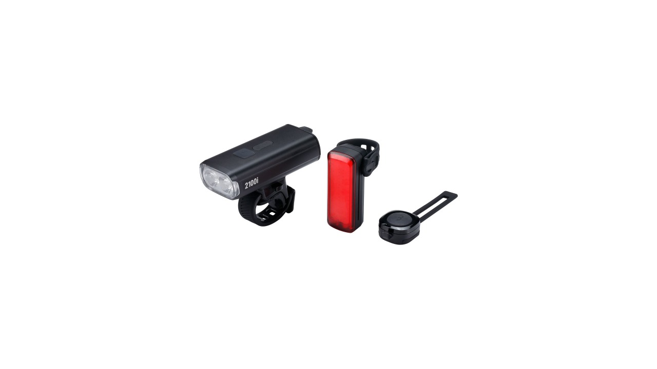 Lichtset StrikeDuo 2100i + BLS-168 inkl. wireless RemoteControl Front StrikeDuo 2100i | BLS-273i Max. Runtime Mode Steady: 75 hours Output / Runtime: 2100 Lumen / 129 Lux (2:00h), 50 Lumen / 3 Lux (75h) Dayflash 140h Safety: Runtime safety mode, fade out Beam distance: 227m Light Type: Dual LED with oval beam (1:1.5) Battery: Dual Lithium Ion 6700 mAh Charge time / port: 4:30h 2A / USB-C Modes steady: Boost, High, Standard, Low, City (saves last mode) Modes flash: Flash, Day Flash, Steady Flash, double-click (saves last mode) Mode secret: High, Low Size / Weight: 110 x 44 x 29mm / 224 grams Fixation: StrapFix Duo Ø 22-52mm (BLS-194) Water resistant: IPX4 Diverse: Battery indicator, Alu-housing, wireless remote included BLS-178i Rear SignalPro | BLS-168 Max. Runtime Mode Steady: 14:30 hours Output / Runtime: 80Lumen/<0.50 Lux (2h), 10 Lumen/ <0.50 Lux (14.30h) Day Flash 21h Safety: Runtime safety mode + 3h Light Type: 2 COB-LED area’s Battery: Lithium Polymer, 1050mAh Charge time / port: 2:10 h / USB-C Modes steady: Low, Standard, High (saves last mode) Modes flash: Flash, Day Flash, Steady Flash (saves last mode) Weight: 57 grams Fixation: Strap mount Ø 5-42mm aero compatible Water resistant: IPX7 Diverse: Battery indicator, 250 Lumen Day Flash